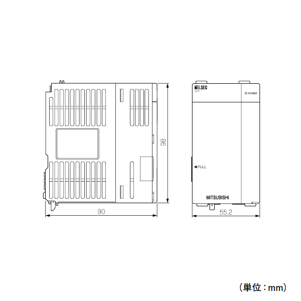 ベース装着位置 電源ユニット装着スロット 適合ベースユニット Q3□B, Q3□DB, Q6□B 入力電源 AC100〜240V +10%/-15% (AC85〜264V) 入力周波数 50/60Hz ±5% 入力電圧歪率 5%以内 入力最大皮相電力 105VA 突入電流 20A 8ms以内 定格出力電流 DC5V 3A DC24V 0.6A 外部出力電圧 DC24V ±10% 過電流保護 DC5V 3.3A以上 DC24V 0.66A以上 過電圧保護 DC5V 5.5〜6.5V 効率 65%以上 部配線 端子ネジサイズ M3.5ネジ 適合電線サイズ 0.75〜2mm2 適合圧着端子 RAV1.25-3.5,RAV2-3.5 外形寸法 H 98mm W 55.2mm D 90mm 質量 0.39kg ■一般仕様 [使用周囲温度] 0〜55℃ [保存周囲温度] -25〜75℃(システムにAnS/Aシリーズユニットが含まれる場合,-20〜75℃) [使用周囲湿度] 5〜95%RH,結露なきこと(システムにAnS/Aシリーズユニットが含まれる場合,10〜90%RH) [保存周囲湿度] 5〜95%RH,結露なきこと(システムにAnS/Aシリーズユニットが含まれる場合,10〜90%RH) [耐振動] JIS B 3502, IEC 61131-2 に適合 ・断続的な振動がある場合 周波数:5〜8.4Hz,片振幅:3.5mm、周波数:8.4〜150Hz,定加速度:9.8m/s2、掃引回数:X,Y,Z各方向10回 ・連続的な振動がある場合 周波数:5〜8.4Hz,片振幅:1.75mm、周波数:8.4〜150Hz,定加速度:4.9m/s2 [耐衝撃] JIS B 3502, IEC 61131-2 に適合(147m/s2,XYZ3方向各3回) [使用雰囲気] 腐食性ガスのないこと [使用標高] 0〜2000m [設置場所] 制御盤内 [オーバボルテージカテゴリ] II 以下 [汚染度] 2以下 [装置クラス] Class 1